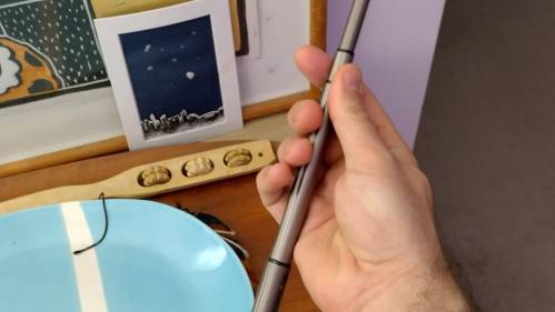 - A hard plastic gray and black telescoping stand with cradle on one end and tripod legs on the other.