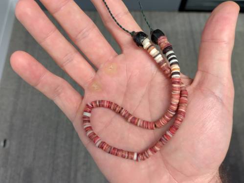 - In the palm of a hand, a short string of several rough red disks of varying shades, each end capped with a large shiny black bead and tied together in a frayed knot.